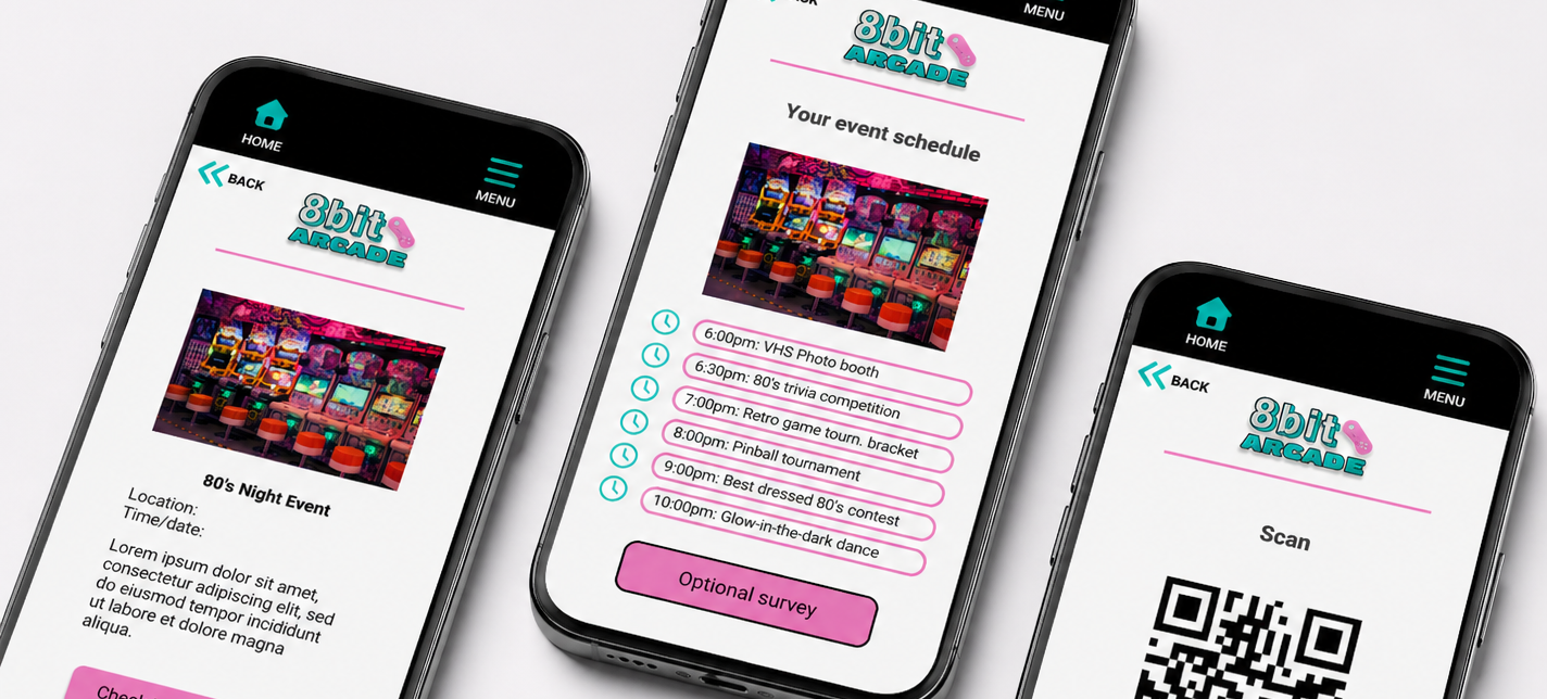 This app was intentionally designed as a mobile-first experience, allowing users to conveniently check in to events directly from their personal devices. By integrating features like QR code scanning, clear event scheduling, and simplified navigation, users can quickly access what they need without unnecessary steps. Every design decision was guided by user needs, ensuring that the experience feels effortless, engaging, and aligned with the fast-paced, nostalgic energy of the 8bit Arcade environment.